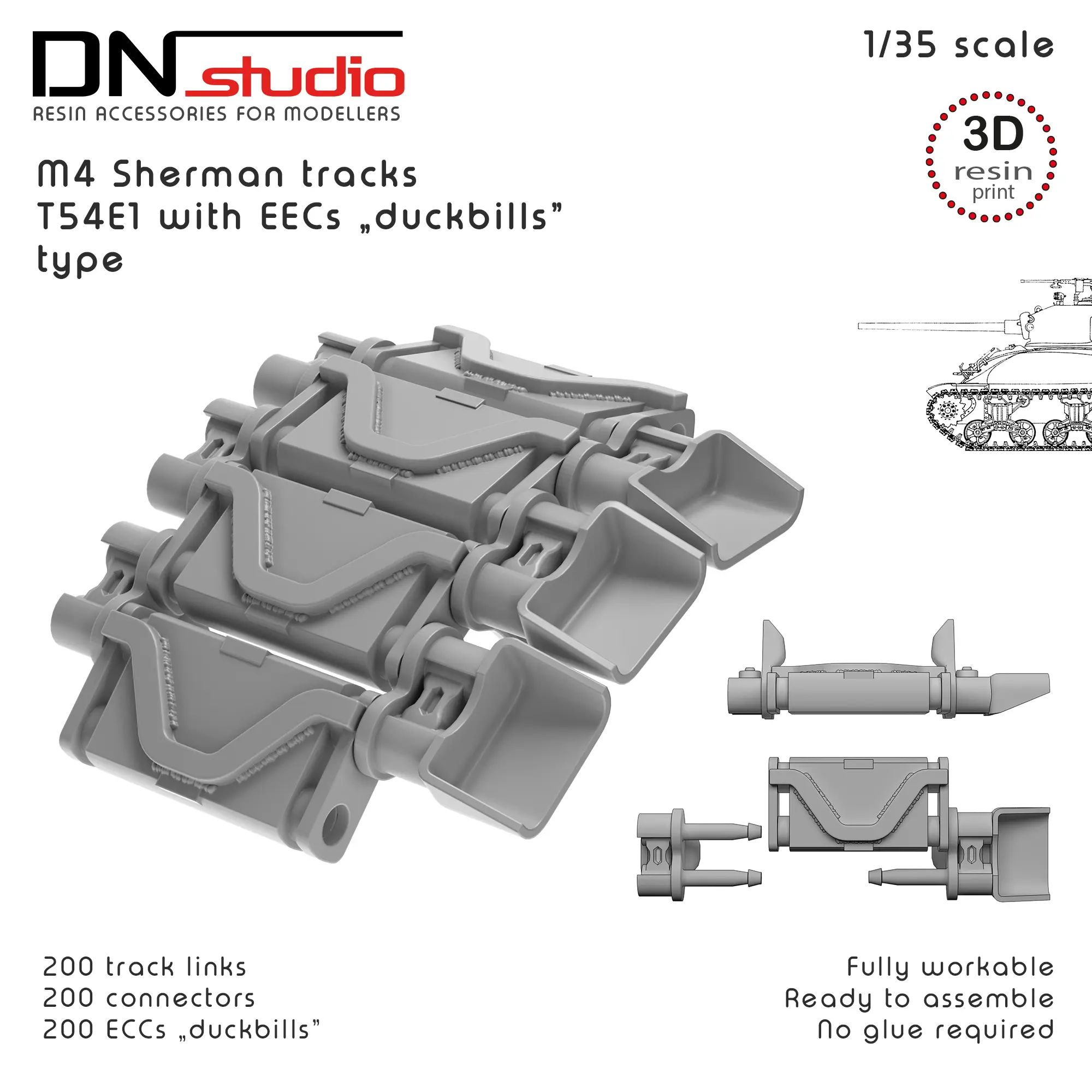 - 1/35 scale Sherman tank workable tracks T54E1 type with ECCs "duckbills"