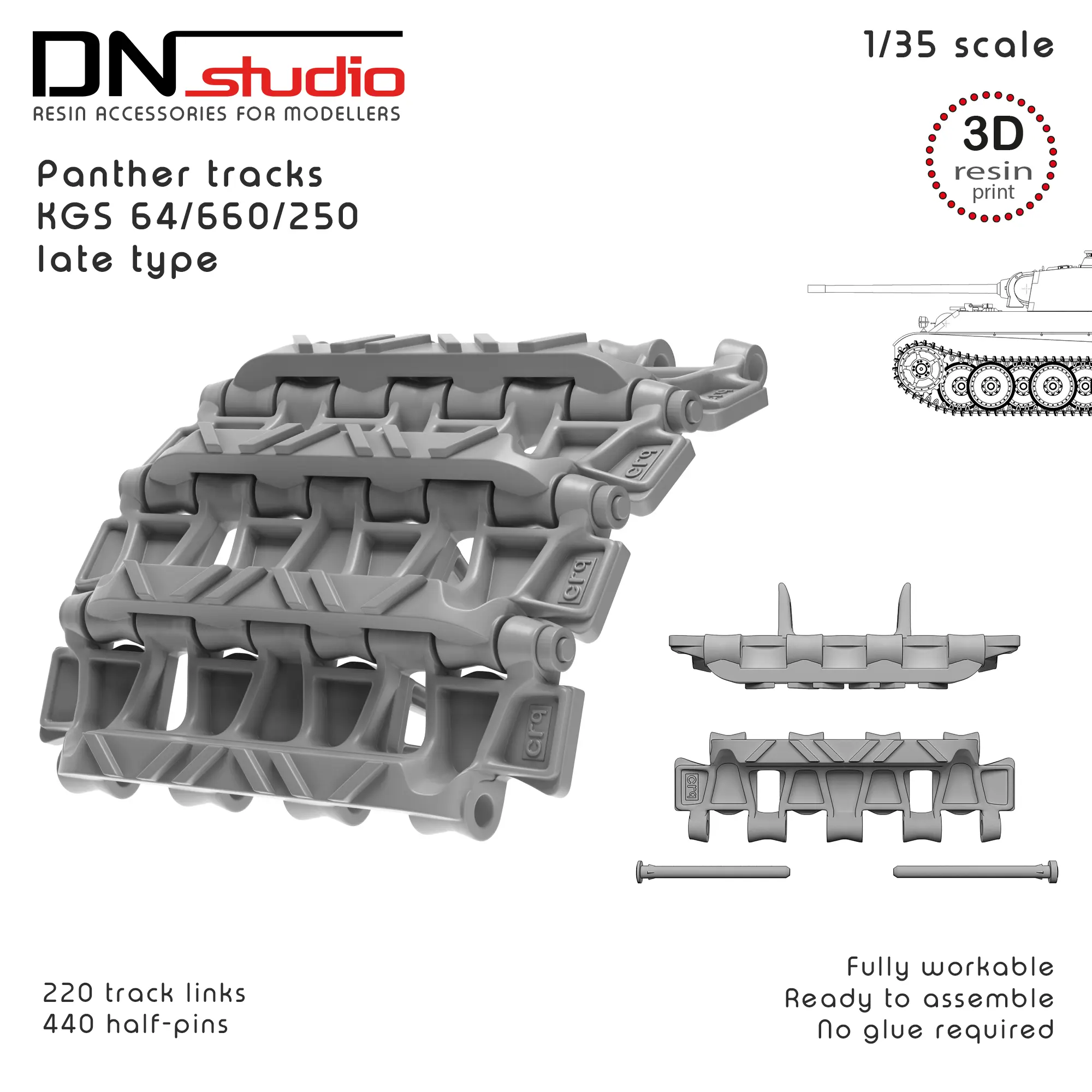 The product is a 1/35 scale workable track set for the WWII Panzerkampfwagen V - Panther german tank late pattern. This resin-printed replica is designed for a Tamiya, Takom, RFM, Meng, Das Werk and Dragon scale modeling kits. This high‑quality resin printed tracks set delivers unmatched precision and value. Perfect for modelers and military vehicles enthusiasts seeking realistic detail without a premium price tag.