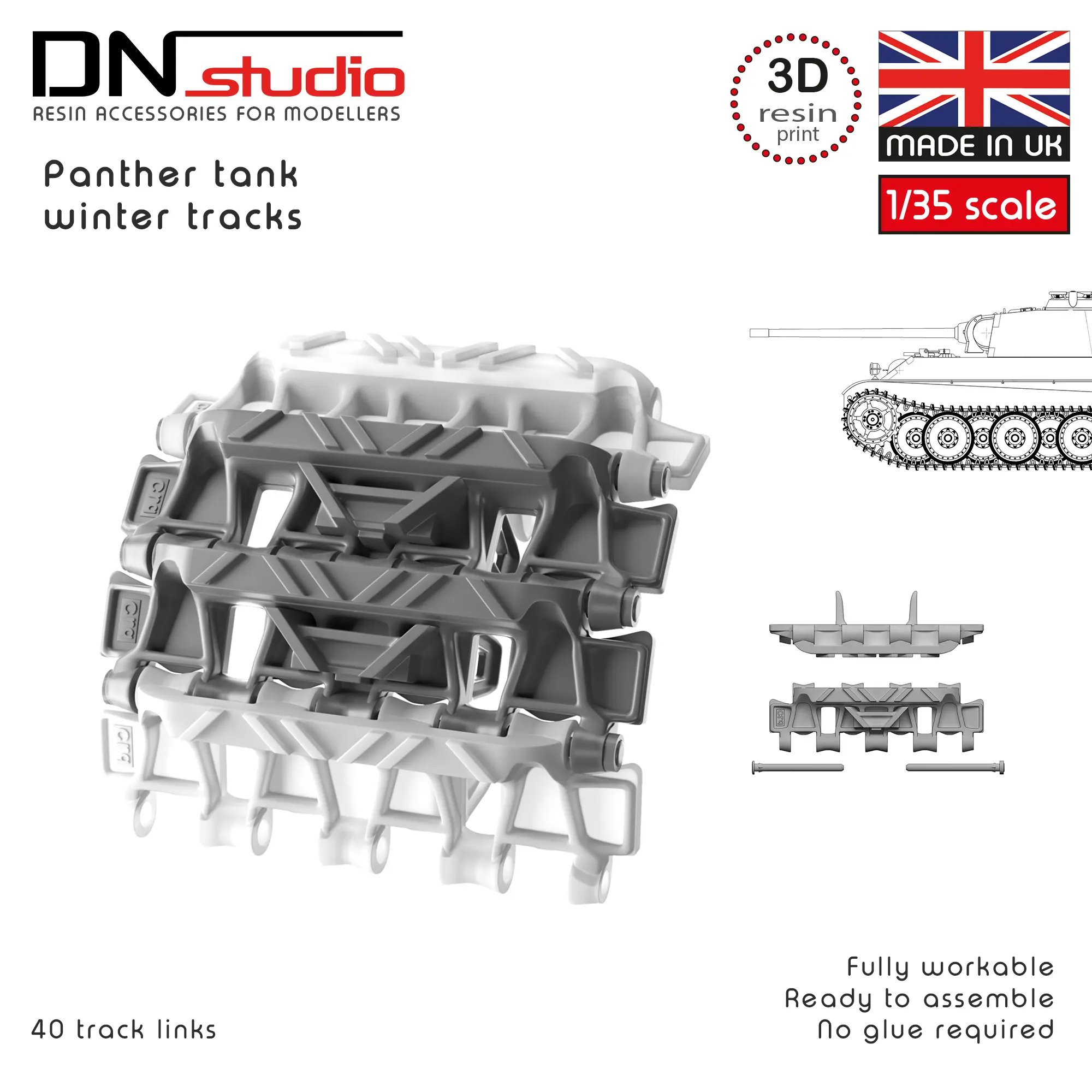 The product is a 1/35 scale winter tracks set for the Panther Tank. This resin-printed replica had been tested on Tamiya, RFM, Border models, Dragon, Takom and Italieri scale modeling kits. This high‑quality resin printed tracks set delivers unmatched precision and value. Perfect for modelers and military vehicles enthusiasts seeking realistic detail without a premium price tag.